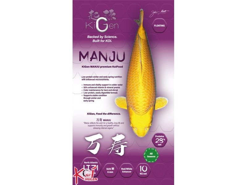 Manju er udviklet til at hjælpe koi sikkert gennem kolde vandperioder. Proteinindholdet er reduceret med 50 %, hvilket gør foderet letfordøjeligt. Fordøjelsessystemet belastes minimalt, når koi er mindre aktive i deres fødeindtag. Den tilgængelige energi udnyttes optimalt til at opretholde kondition og modstandskraft frem for vækst.