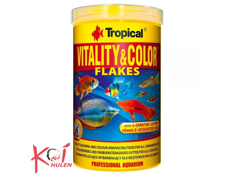 VITALITY & COLOR er et proteinrigt flagefoder med en farveforstærkende og revitaliserende effekt. Foderet er beregnet til daglig fodring af altædende og kødædende akvariefisk, især til opdrættede fisk, der kræver farveforstærkning, og fisk, der vokser intensivt eller i gydeperioder. Høje proteinniveauer, lecithin fra æggeblomme og E-vitamin stimulerer reproduktionen og har en positiv effekt på fiskens vækst og modning. Naturlig astaxanthin fra for eksempel krill intensiverer fiskens farver, og L-carnitin hjælper fisken med at udnytte fedtet i foderet. Tilsætning af zeolit har en gavnlig effekt på fordøjelsessystemet og udskillelsen af toksiner fra fisken.