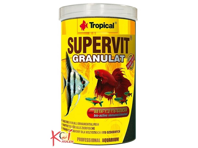 SUPERVIT GRANULER er et højkvalitets, komplet, rigt grovkornet foder beregnet til daglig fodring af alle akvariefisk. Foderet indeholder en naturlig immunstimulator BETA-1,3/1,6-GLUCAN og stabiliseret C-vitamin, som effektivt styrker fiskens immunforsvar og beskytter mod forskellige infektioner. Cellulose og kitin forbedrer fordøjelsen og forebygger forstoppelse, carotenoider forbedrer farverne, og lecithin øger vitaliteten og hjælper med at stimulere ynglingen.